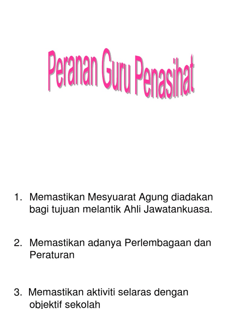 TUGAS-TUGAS DAN TANGGUNGJAWAB GURU PENASIHAT PERSATUAN. Memastikan Mesyuarat Agung diadakan bagi tujuan melantik Ahli Jawatankuasa. PERATURAN 5 GURU PENASIHAT 51 Guru Penasihat adalah teridiri daripada guru-guru sekolah ini SMK.
